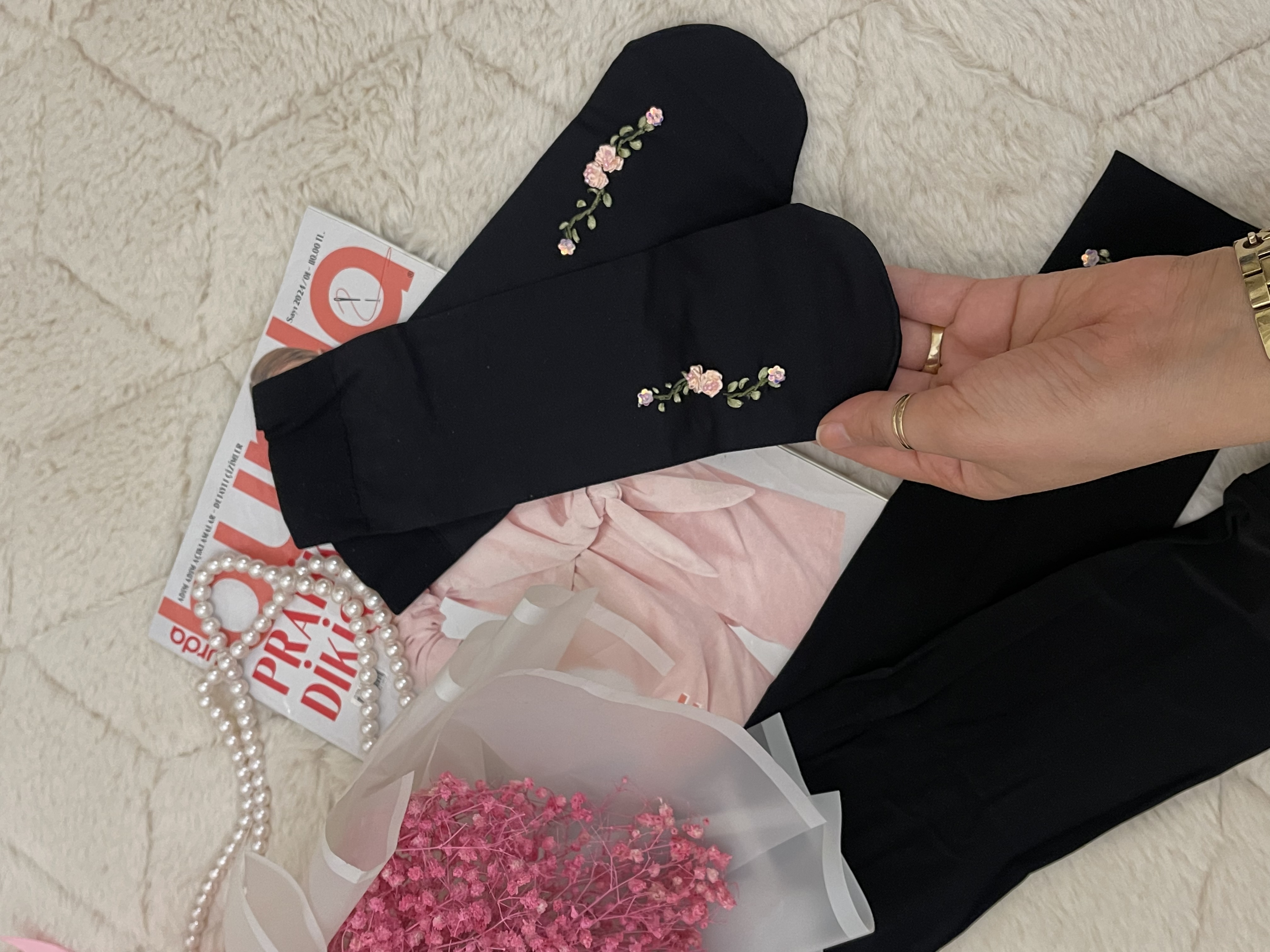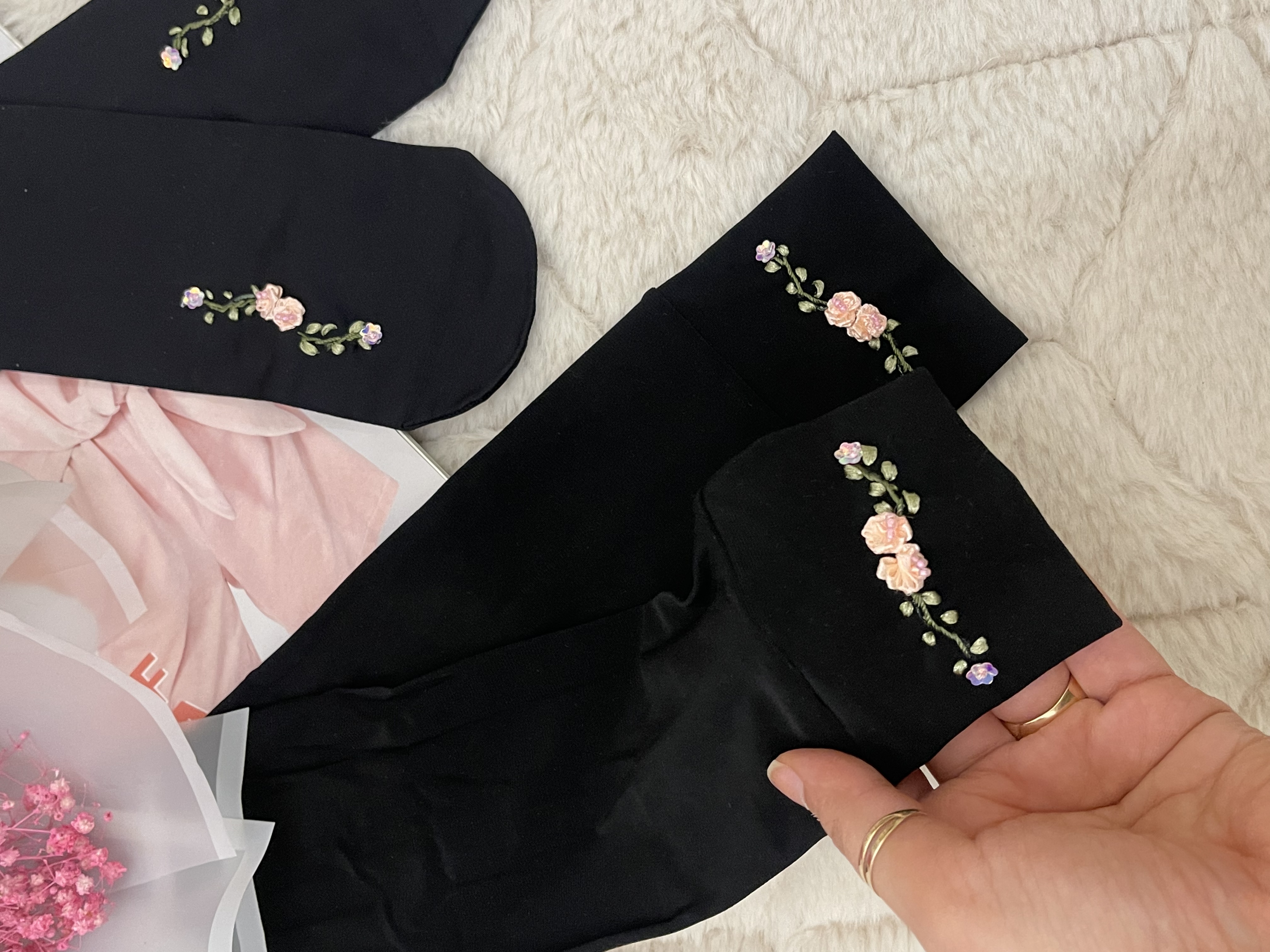 ست جوراب و ساق دست روبان دوزی گل صورتی