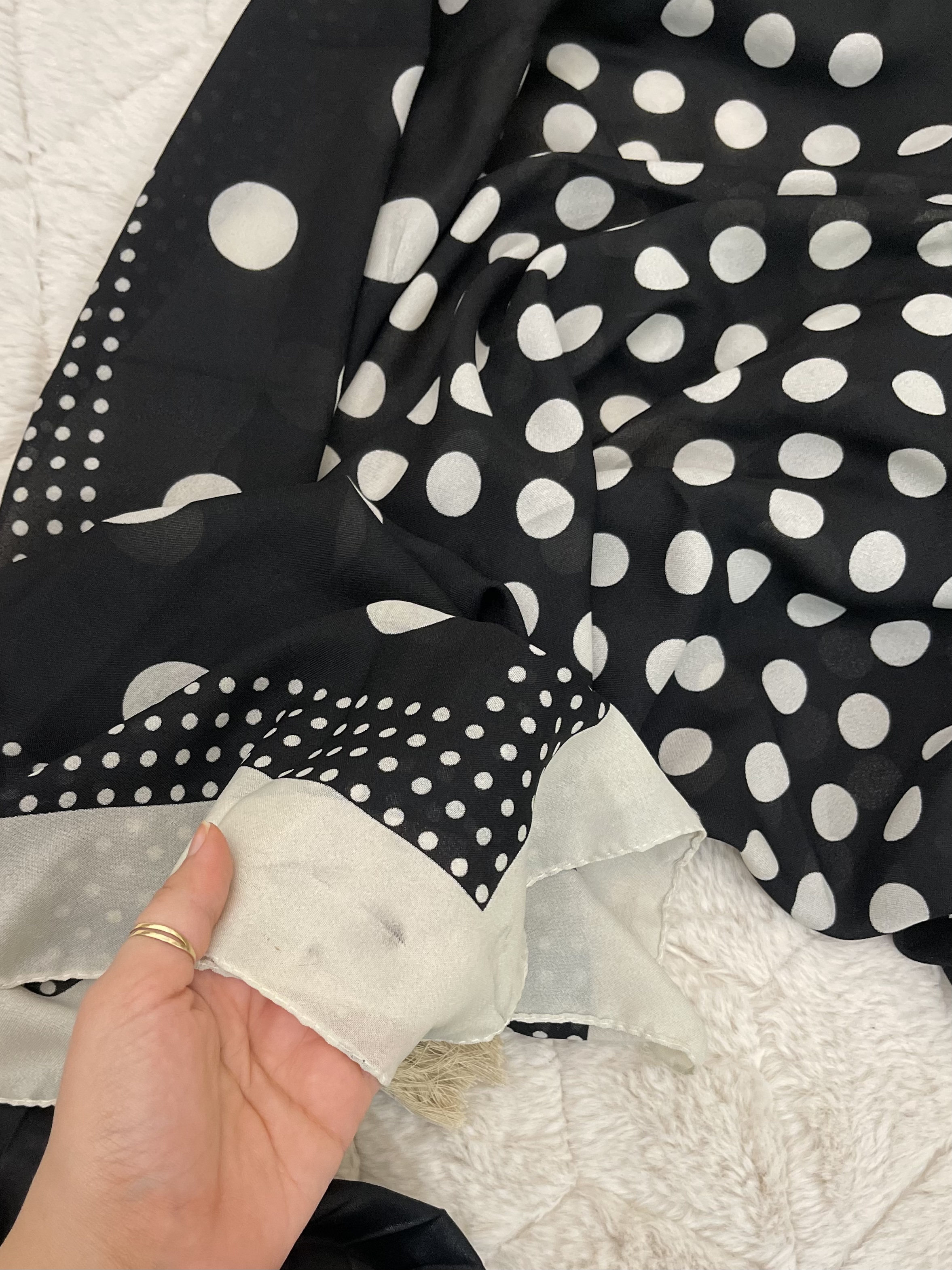 جزئیات : چروک نمیشه/ایستایی خوبی داره/منگوله داره/دور دوخت هست/چند تا لک کوچیک داره که نمونه عکاسی شده و گذاشتیم