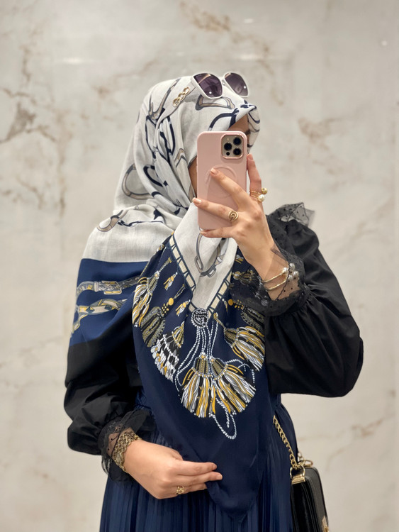 روسری نخ پنبه سورمه ای طرح زنجیری