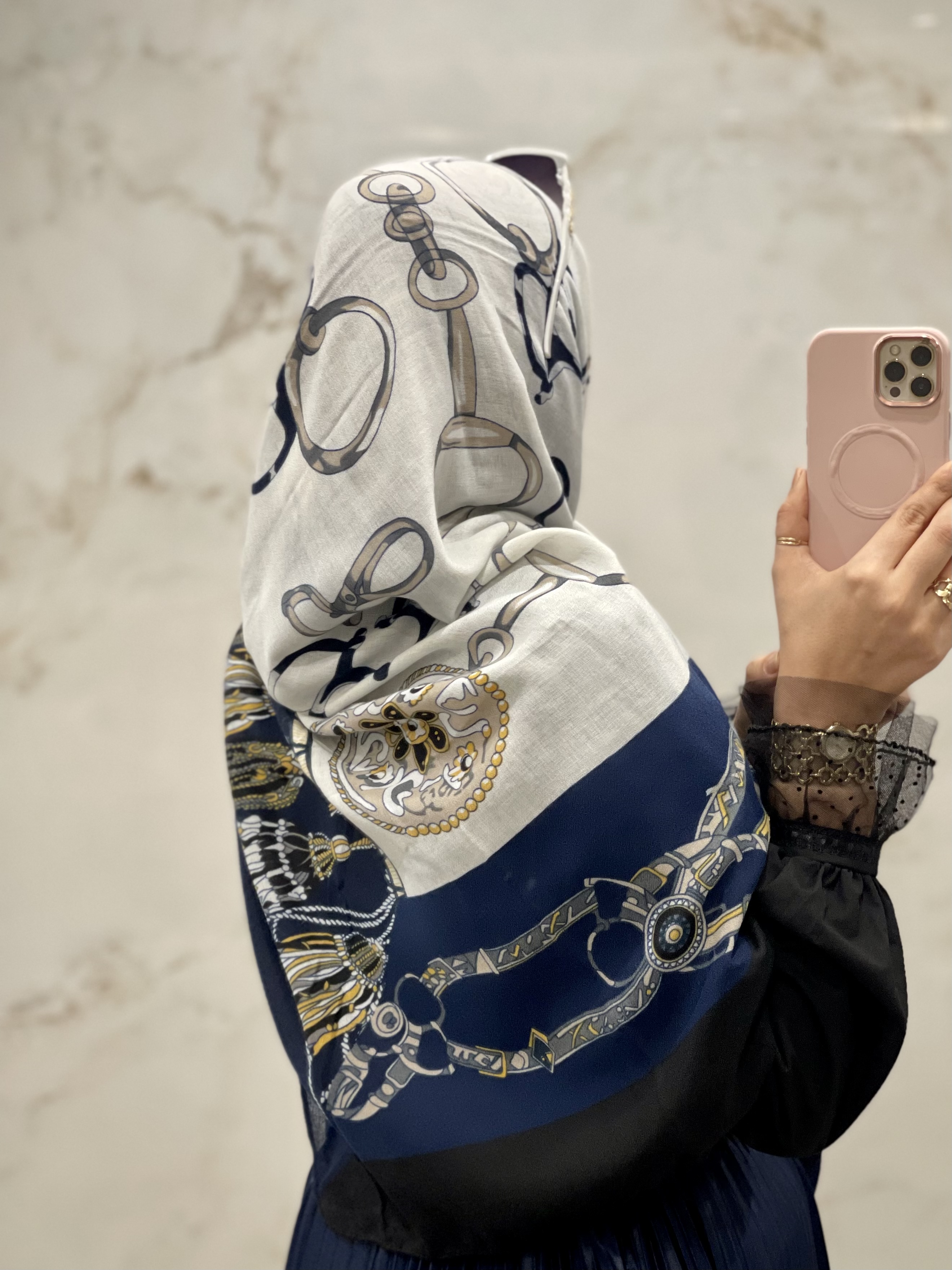 روسری نخ پنبه سورمه ای طرح زنجیری