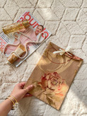 جزئیات : جنس بسیار مرغوب و با کیفیتی داره/برای هدیه بسیار شیک و فوق العاده هست و یه حس خیلی خوبی رو انتقال میده/سایز بگ ۲۲ در ۳۰ سانت هست که برای روسری و پوشاک مناسبه و با روبان خیلی ناز بسته میشه